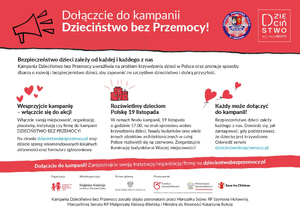 Kulminacyjnym punktem kampanii będzie 19 listopada – Międzynarodowy Dzień Przeciwdziałania Przemocy wobec Dzieci, obchodzony jako symbol sprzeciwu wobec krzywdy najmłodszych. Tegoroczna edycja trwa od 6 października do 19 listopada i przypomina, że każde dziecko ma prawo do dorastania w atmosferze bezpieczeństwa, miłości i szacunku.