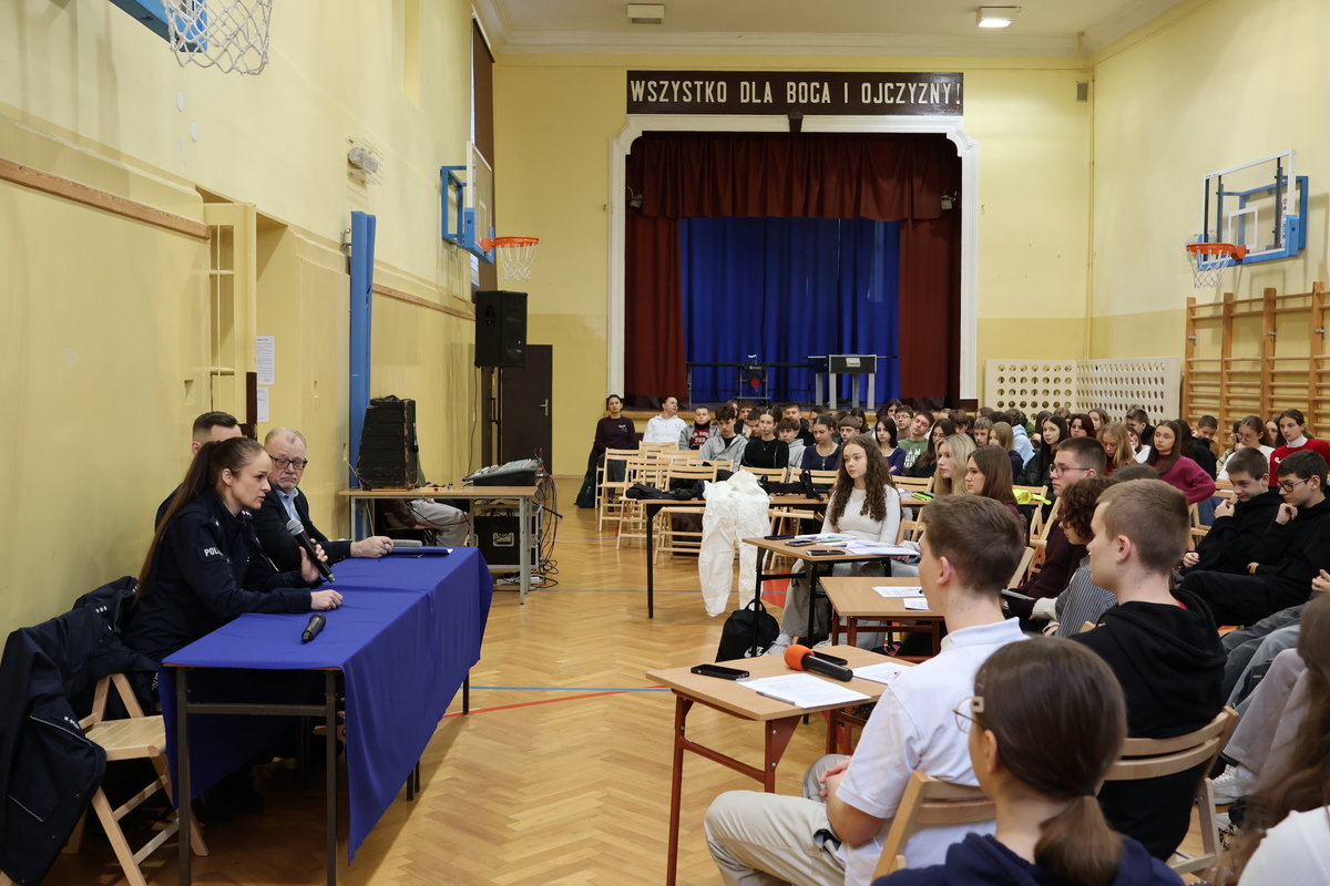 Wczoraj, funkcjonariusze z łańcuckiej komendy wraz z policjantami z Sekcji Doboru Wydziału Kadr i Szkolenia Komendy Wojewódzkiej Policji w Rzeszowie promowali policyjną służbę wśród młodzieży szkolnej. W spotkaniu, które odbyło się na sali gimnastycznej II Liceum Ogólnokształcącego w Łańcucie, wzięli udział licealiści z klas o kierunkach związanych z kryminalistyką oraz prawem i bezpieczeństwem narodowym, a także uczniowie ósmych klas szkół podstawowych.