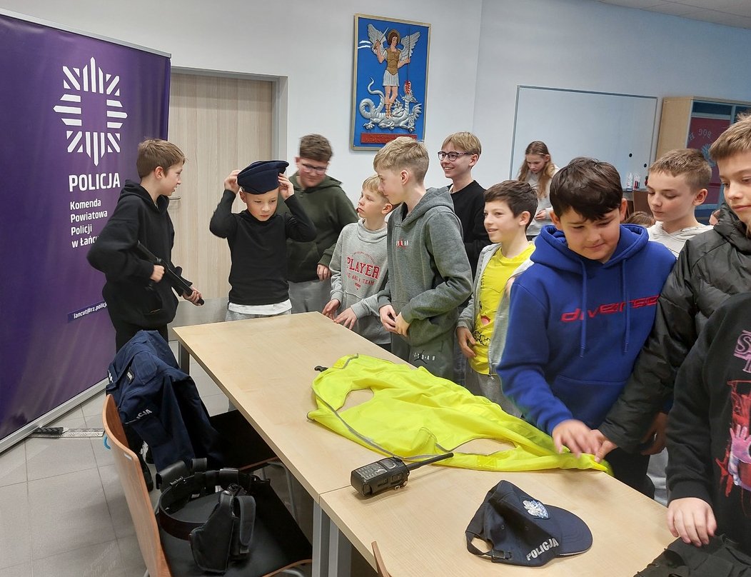 Po prelekcji młodzi goście mieli także możliwość przyjrzenia się bliżej policyjnemu wyposażeniu i radiowozowi. Dzieci chętnie przymierzały elementy policyjnego umundurowania oraz pozowały do pamiątkowych zdjęć.