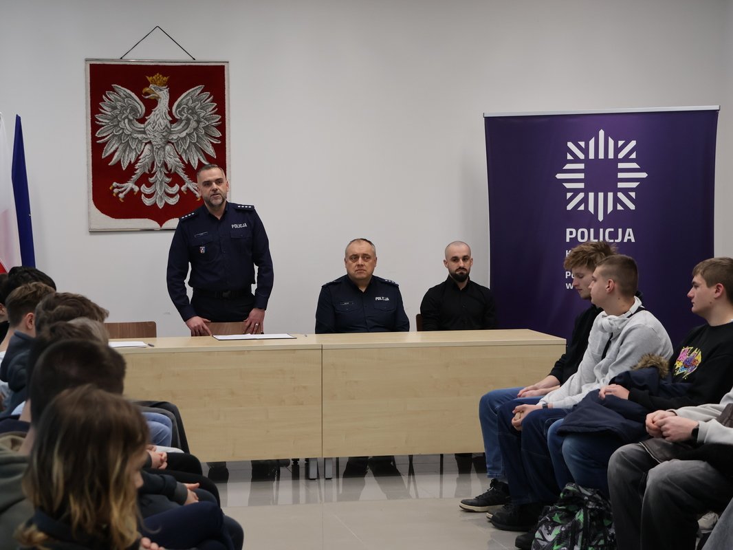 Po nim głos zabrał st. sierż. Jakub Kotliński funkcjonariusz Wydziału Kryminalnego zajmujący się na co dzień przestępstwami z użyciem środków i usług cyfrowych. Na podstawie przygotowanej prezentacji pn. „Kiedy żart staje się przestępstwem?” przybliżył odpowiedzialność prawną młodzieży oraz algorytm postępowania w przypadku styczności ze sprawcą jak też ofiarą cyberprzemocy. Wśród poruszanych kwestii znalazły się także zagadnienia dotyczące m.in. anonimowości i prywatności w sieci, cyberhigieny oraz najczęstszych internetowych zagrożeń.